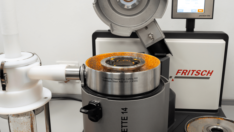 The next step was to place the pre-crushed pieces in a suitable vessel and embrittle them with liquid nitrogen N2. Sieve shells with trapezoidal perforation 1 mm in the cutting rotor were used. The crushed sample was collected in the collecting vessel and the sample glass of the small volume Cyclone separator. The small volume cyclone was used passively without a vacuum.